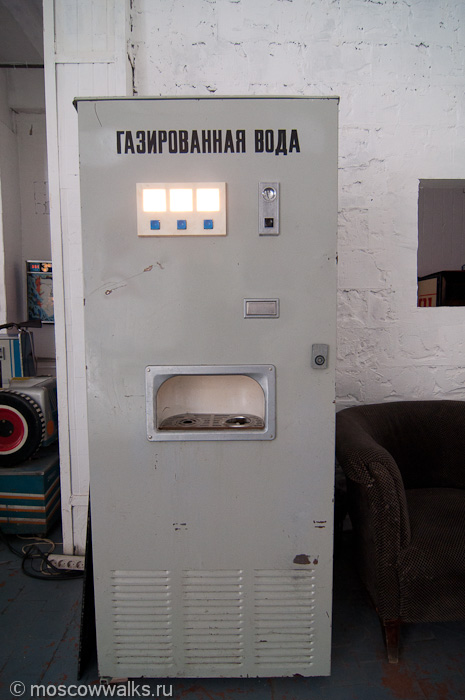 В углу стоят раритетные автоматы. 1 коп – без сиропа. 3 коп – с сиропом на выбор из двух: в данном случае, крем-сода и грушевый. Один автомат работает, монеты можно приобрести отдельно.